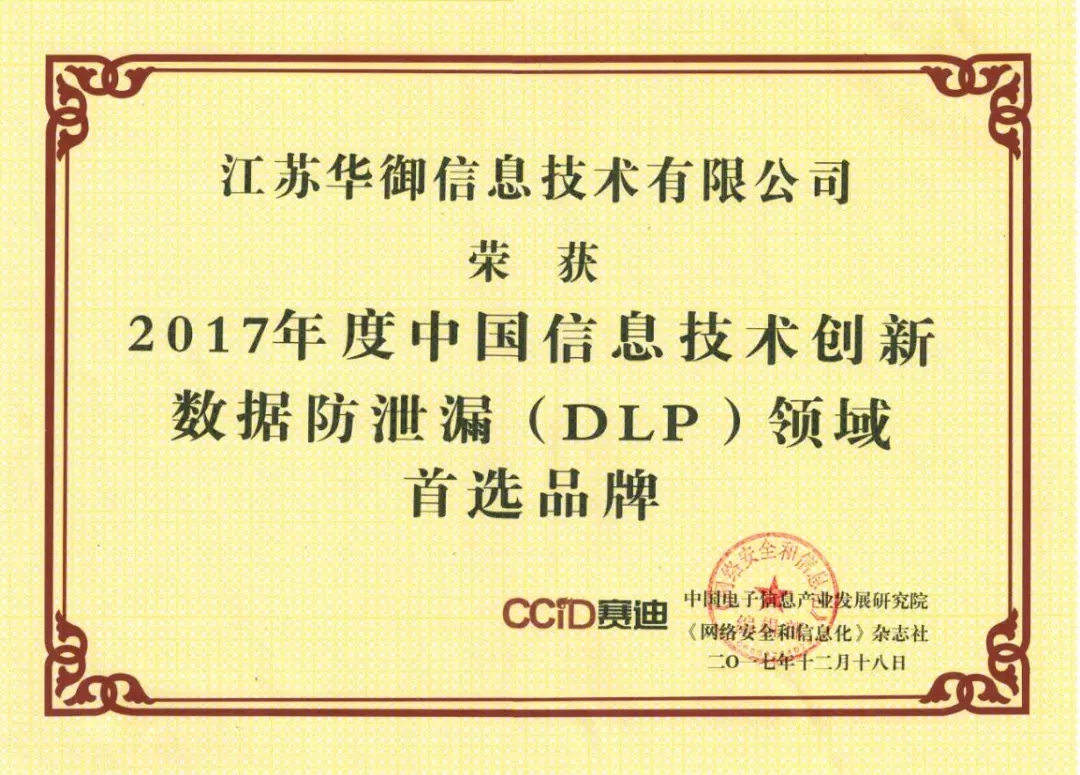 此外,本届大会还通过IT运维网调查,同时结合相关专家的评审意见,评选出了具有含金量的“2017中国信息技术创新大会”的各项奖项,江苏华御信息技术有限公司在此次评选中得到专家们的一致认可,并被评选为2017年度中国信息技术创新数据防泄漏(DLP)领域首选品牌!